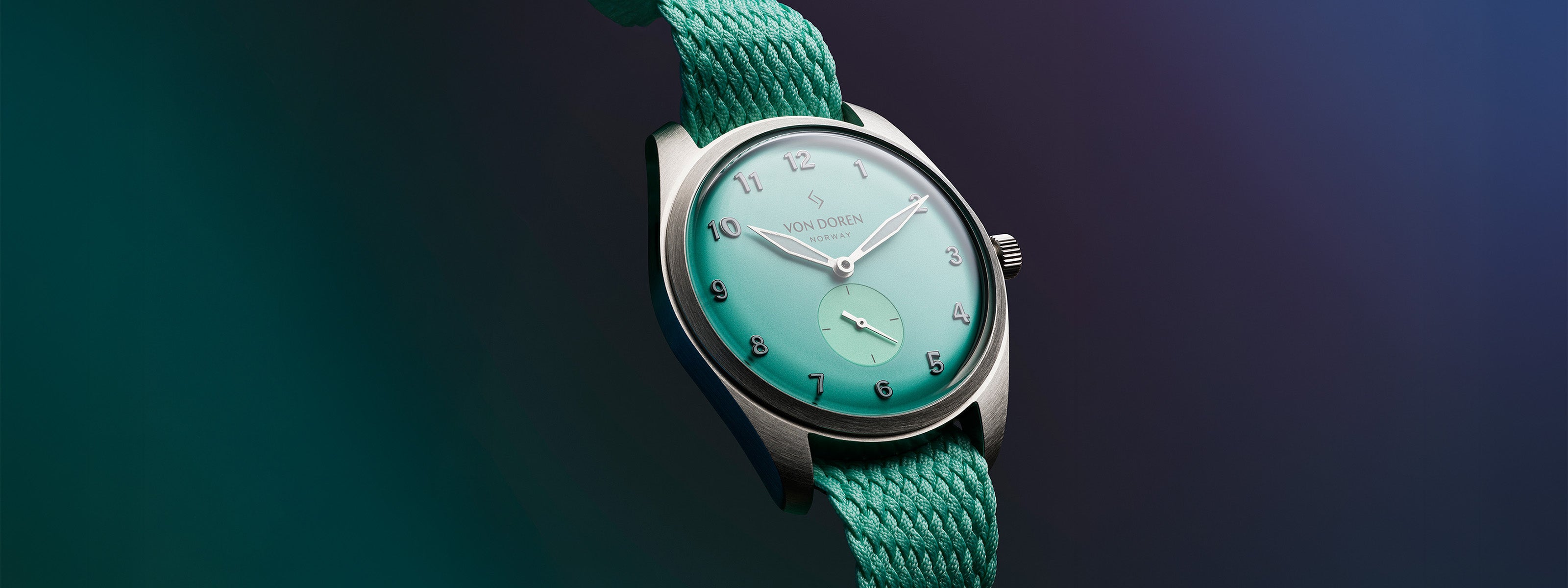 Von Doren Runde Candy Sugar med hvit urskive og grønn perlonrem som svever mot en mørk gradientbakgrunn."